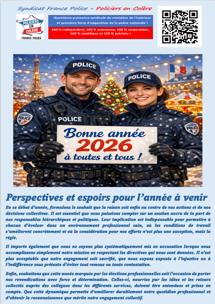 Meilleurs vœux 2026 5 janvier 2026syndicatfrancepolicepaca Partager : Cliquer pour partager sur X(ouvre dans une nouvelle fenêtre) X Cliquez pour partager sur Facebook(ouvre dans une nouvelle fenêtre) Facebook J’aime chargement…
