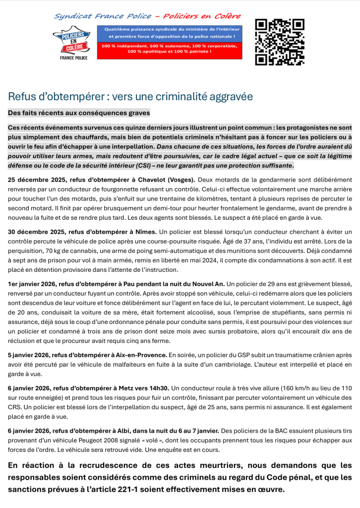 Au fil de l’année 2025, le quotidien des policiers s’est considérablement durci. Les faits récents illustrent la violence à laquelle sont confrontés les agents sur le terrain : le 10 novembre à Bourges, un policier de la BAC a été pris pour cible et blessé par balle lors d’une intervention sur un cambriolage. Quelques semaines plus tard, le 3 décembre à Castres, dans le quartier de Lameilhé, deux policiers ont été blessés à la tête et un troisième au torse, visés par des tirs provenant d’un véhicule en fuite. Le même jour à Marseille, dans le quartier de la Castellane, trois policiers de la BAC ont été violemment agressés alors qu’ils procédaient à l’interpellation d’un individu. Ces exemples, loin d’être isolés, témoignent d’une multiplication des actes de violence envers les forces de l’ordre.