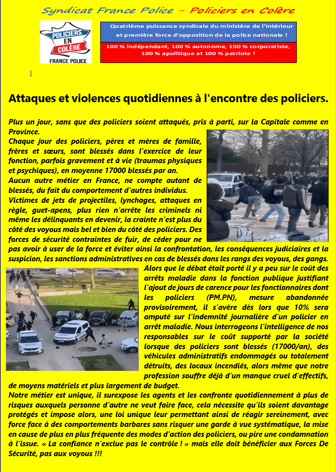 Nous réclamons que des sanctions pénales soient appliquées avec la même sévérité aux auteurs qui s’en prennent aux forces de l’ordre.